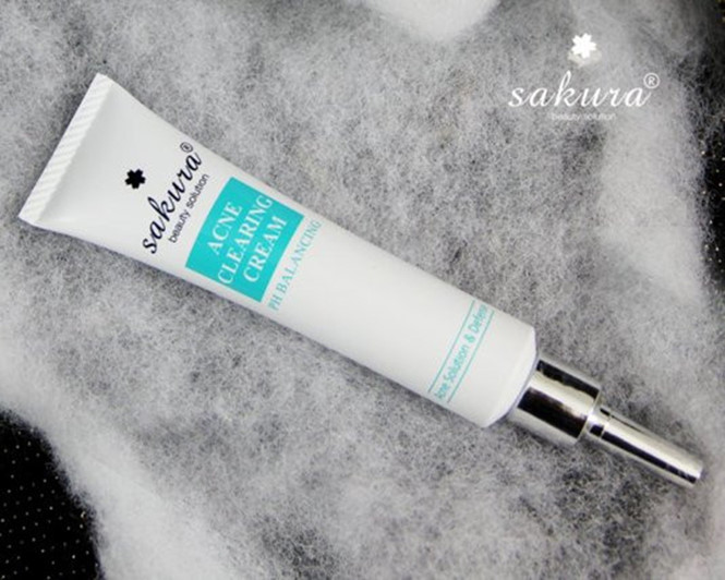 Nếu chấm điểm về độ lành tình cho da thì Sakura Acne Clearing Cream của nhà Sakura Nhật Bản thuộc top hoàn hảo nhất. Là loại kem chấm mụn có thành phần hoạt chất chính là chiết xuất hoa anh đào, chiết xuất phong lữ có khả năng thâm nhập sâu vào lỗ chân lông, giúp làm sạch sâu, kháng viêm kháng khuẩn, giảm mụn sưng tấy. Ngoài ra trong sản phẩm này còn có chứa chiết xuất comfey, butylene glycol… giúp tăng khả năng sát khuẩn, làm dịu nốt sưng đỏ, giảm kích ứng da.